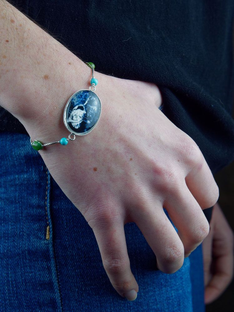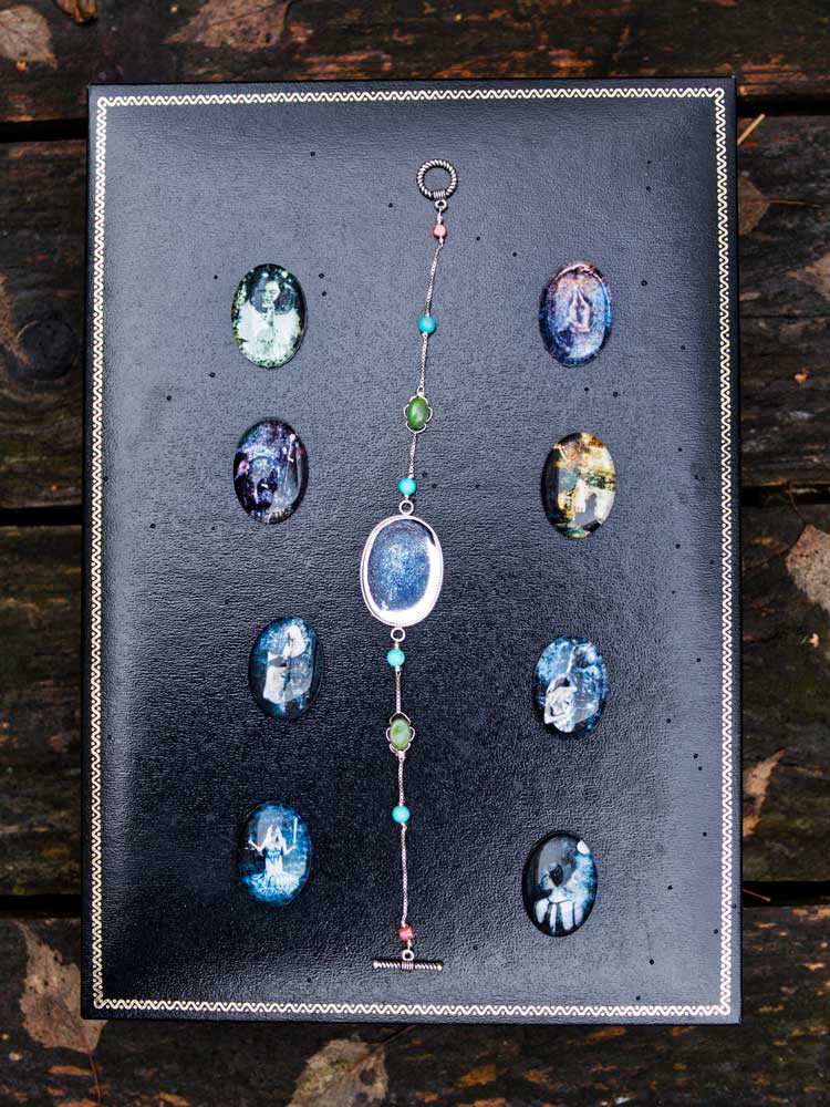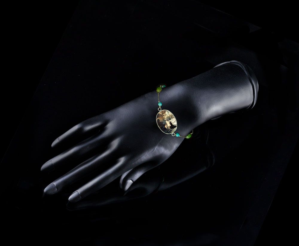 Ce bracelet est réalisé entièrement à la main par Justine Darmon et fait partie de la série Les bijoux des Lames du tarot.