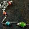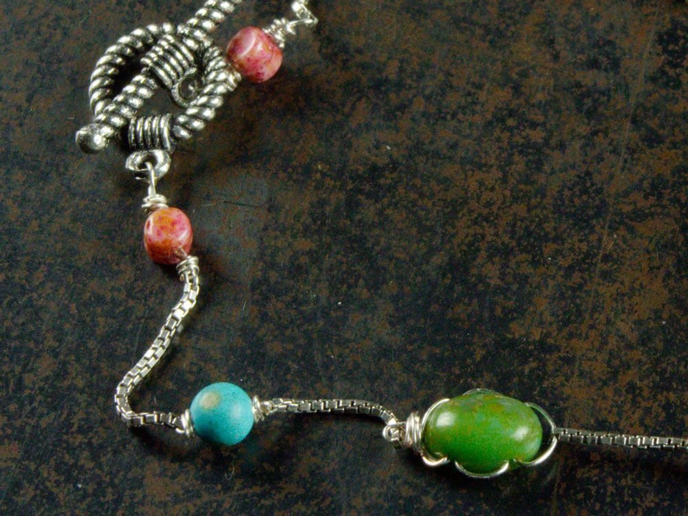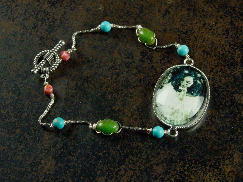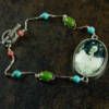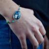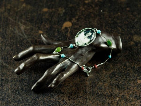 Ce bracelet est composé de Turquoise , de perles en verre « Samos » vert turquoise, de perles Minos rose et d’un cabochon à l’effigie d’une arcane Majeure du tarot les lames de l’Âme. La chaine est en argent et le support du cabochon en laiton galvanisé argent (Sans cadmium, sans nickel et sans plomb).