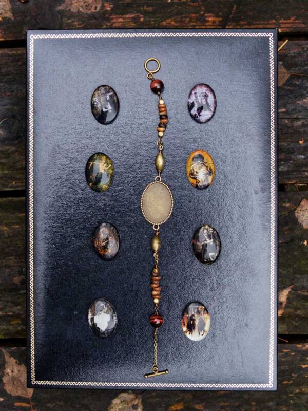 La monture du Bracelet peut être associée à plusieurs arcannes majeurs des lames de l’Âme proposés dans les choix de cabochon, mais le couple formé par une arcanne et une monture ne sera produite qu’une fois. La monture étant réalisée entièrement à la main, elle ne pourra pas être reproduite exactement à l’identique. Toutefois, si vous souhaitez acquérir cette monture avec une arcane ne figurant pas dans les choix, vous pouvez me contacter pour la réalisation sur commande.
