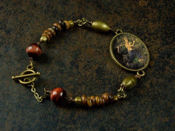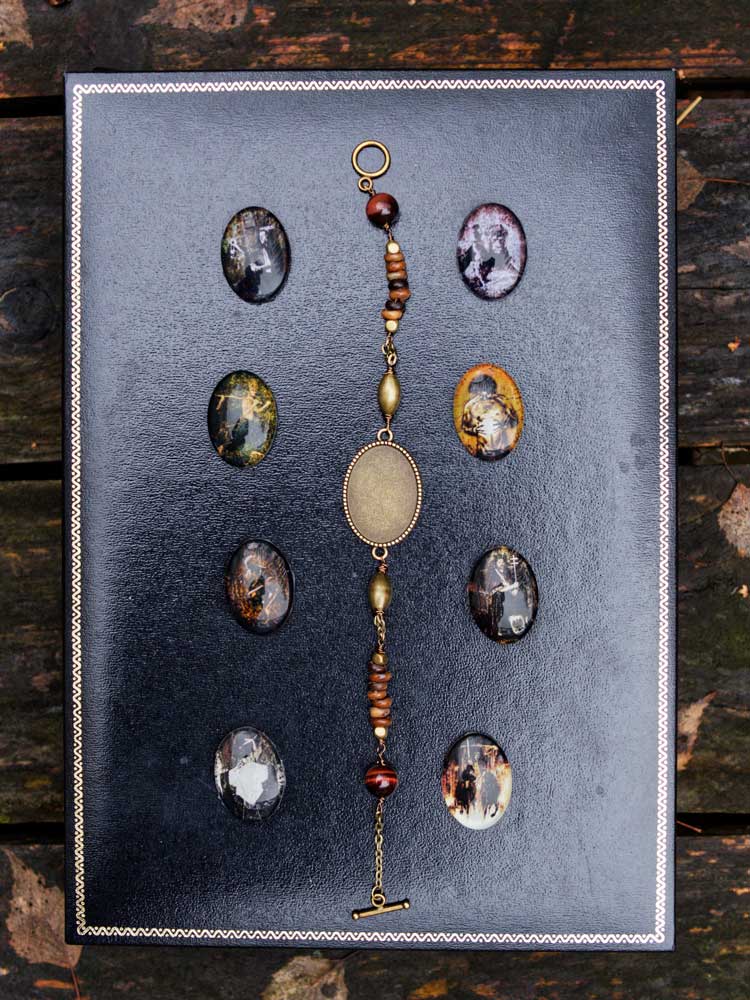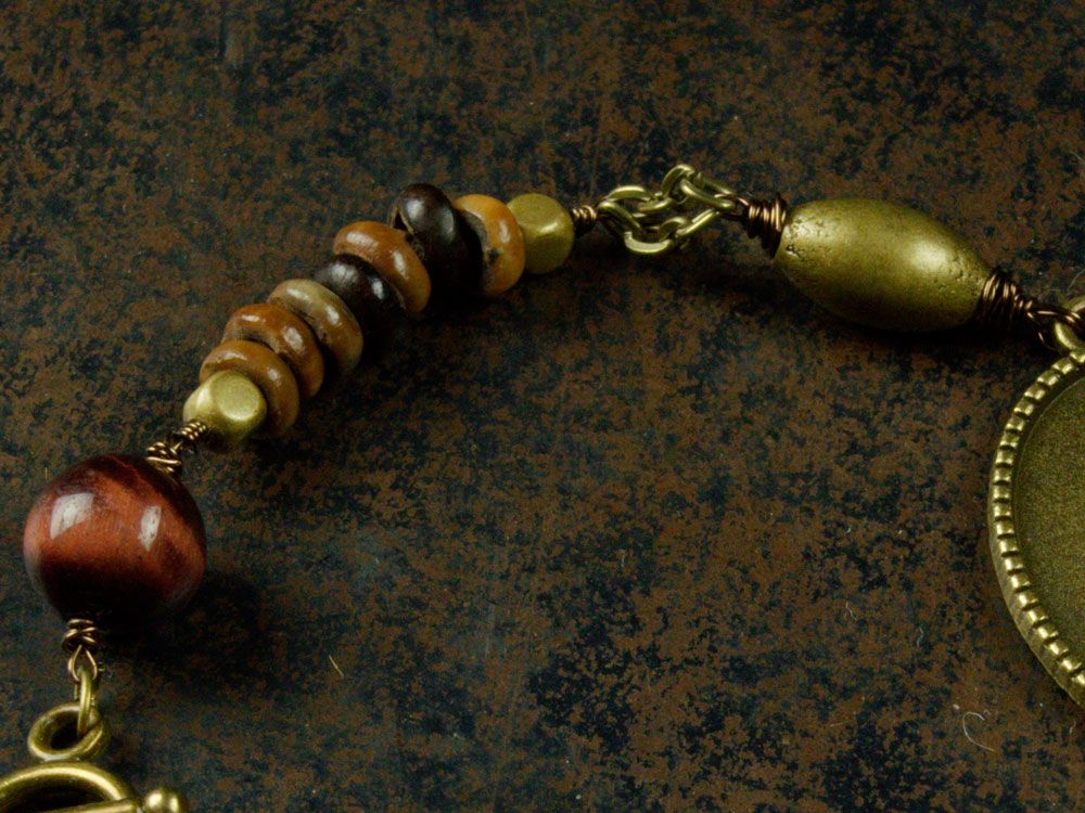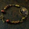 Ce bracelet est composé d’œil du tigre, des perles en coco, de perle oblongue en bronze et d’un cabochon à l’effigie d’une arcane Majeure du tarot les lames de l’Âme. La chaine est en laiton galvanisée en Bronze ainsi que le support du cabochon (Sans cadmium, sans nickel et sans plomb).