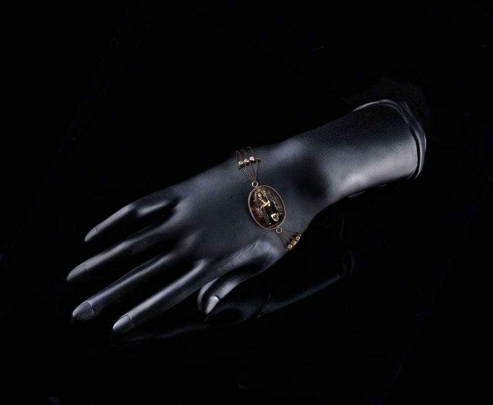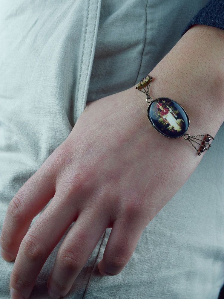 Ce bracelet est réalisé entièrement à la main par Justine Darmon et fait partie de la série Les bijoux des Lames du tarot.