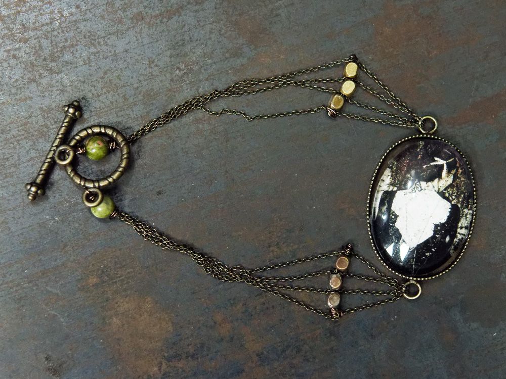 Ce bracelet est composé de Turquoise Africaines, des perles carrées en bronze et d’un cabochon à l’effigie d’une arcane Majeure du tarot les lames de l’Âme. La chaine est en laiton galvanisée en Bronze ainsi que le support du cabochon (Sans cadmium, sans nickel et sans plomb).