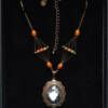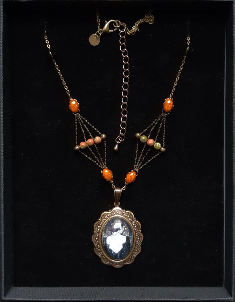 Ce collier est composé d’Unakite, de perles en verre « Samos » orange, de perles vertes métallisées et d’un cabochon à l’effigie d’une arcane Majeure du tarot les lames de l’Âme. La chaine est en laiton galvanisée en Bronze ainsi que le support du cabochon (Sans cadmium, sans nickel et sans plomb).