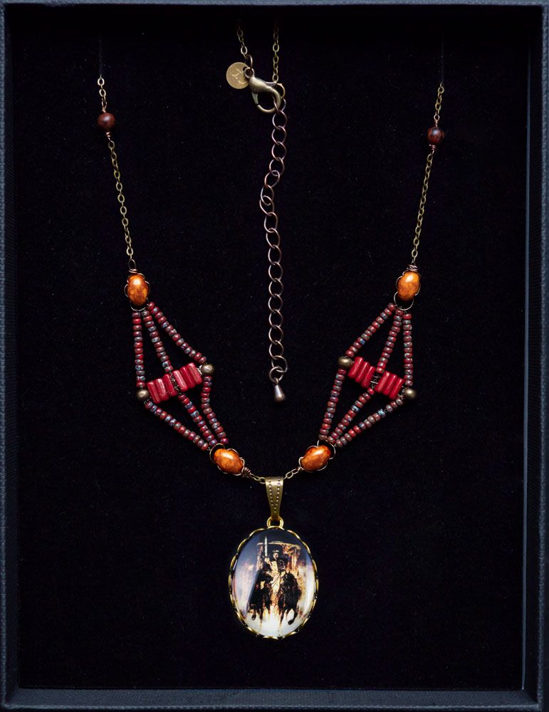 Ce collier est composé d’obsidienne acajou, de perles en verre « Samos » orange, de perles minos et piros rouge et d’un cabochon à l’effigie d’une arcane Majeure du tarot les lames de l’Âme. La chaine est en laiton galvanisée en Bronze ainsi que le support du cabochon (Sans cadmium, sans nickel et sans plomb).