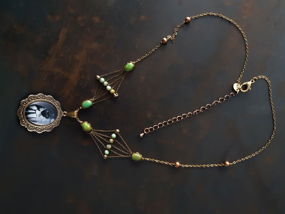 Ce collier est composé de Turquoise Africaines, des perles en verre « Samos » vert turquoise, de perles en verre vert métallisé et d’un cabochon à l’effigie d’une arcane Majeure du tarot les lames de l’Âme. La chaine est en laiton galvanisée en Bronze ainsi que le support du cabochon (Sans cadmium, sans nickel et sans plomb).