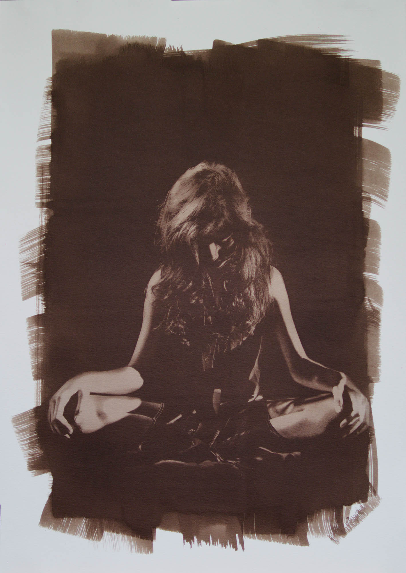 Eclipse, composée de 18 photos, est tirée sur papier d’art en Process Van Dyck et en Cyanotype. Les couleurs de chaque procédé font écho à la terre nourricière et à la lune créatrice, mère de nos songes et de nos craintes, ambivalences féminines.